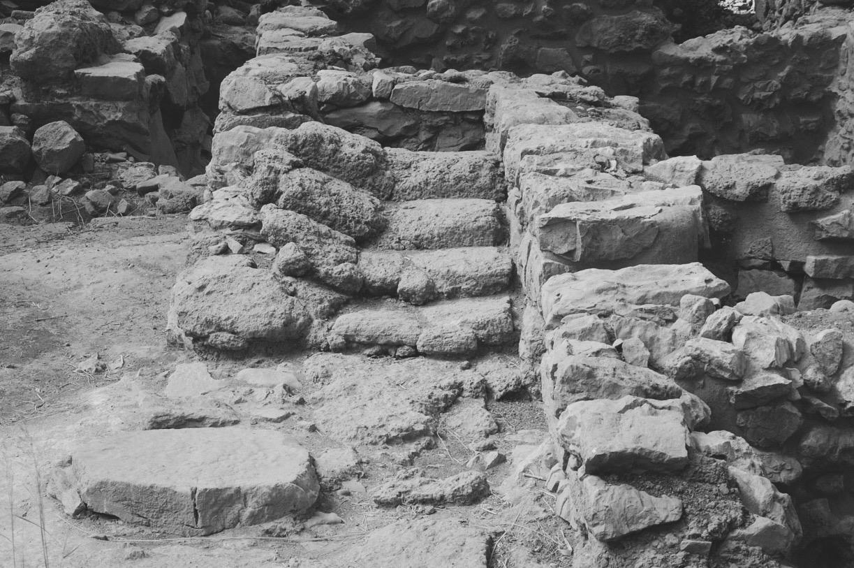 ▲ [1] Detail des Untergeschosses von „Gebäude B“ mit der Zwischenboden-Konstruktion aus Bohlen und Querlatten. [2] Lagerraum in „Gebäude B“ von „Quartier Mu“ in Malia.