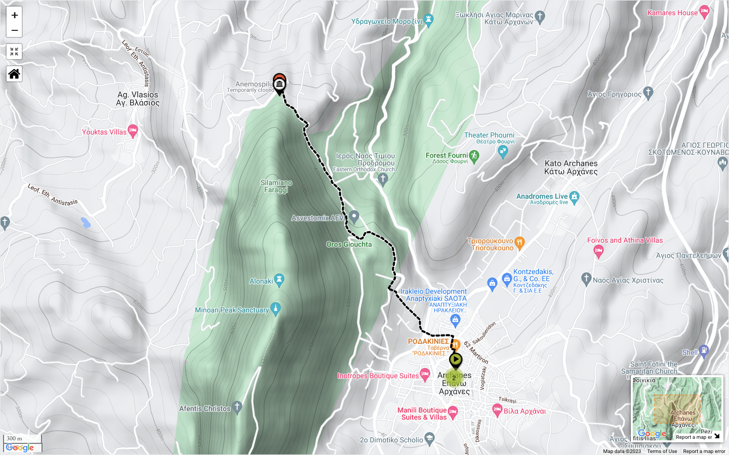 Vom minoischen “Palast” im Tourkogeitonia-Viertel von Archanes ging es für etwas mehr als drei Kilometer auf relativ guten Straßen zum Parkplatz vor dem Tempel von Anemospilia auf ca. 420m üNN. Da der Palast selbst schon recht hoch auf ca. 390m üNN liegt, beträgt die Höhendifferenz nur etwa 25 Meter. Doch weil der Weg zwei Mal in Richtung des Flusbetts des Katsambas hinab- und dann wieder hinaufführt, sind Gesamtanstieg und -abstieg im Vergleich dazu relativ umfangreich.